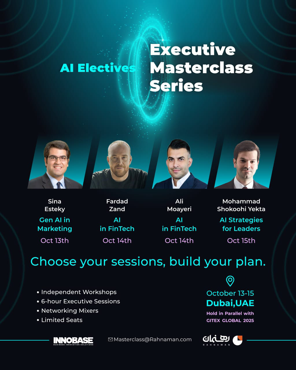 شرکت مشاوره مدیریت رهنمان با همکاری INNOBASE، همزمان با نمایشگاه GITEX 2025 در دبی، مجموعهای از کارگاههای بینالمللی تخصصی در حوزه هوش مصنوعی را ویژه مدیران ارشد و تصمیمگیران ایرانی را با حضور اساتید و متخصصان بینالمللی و در محورهای