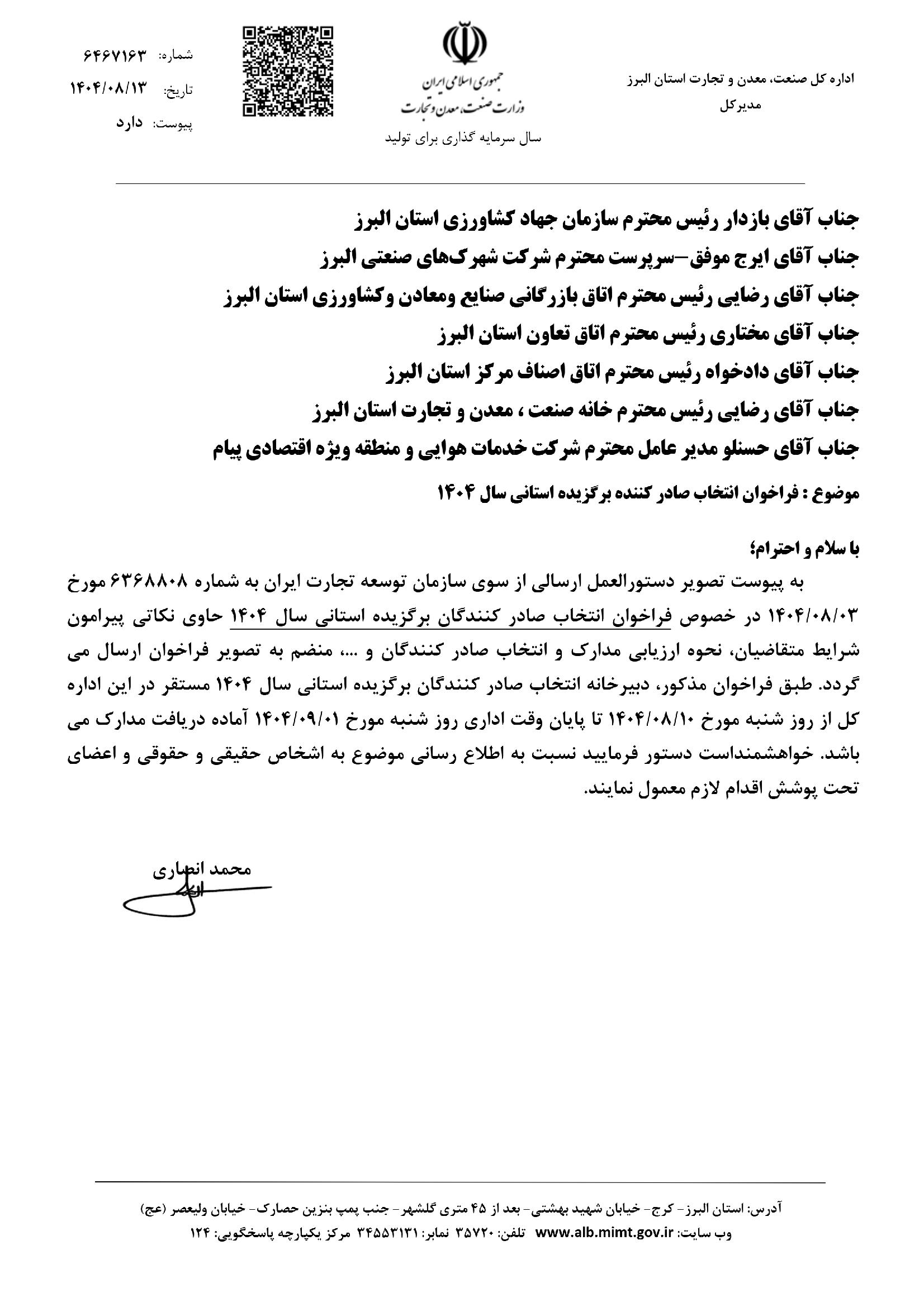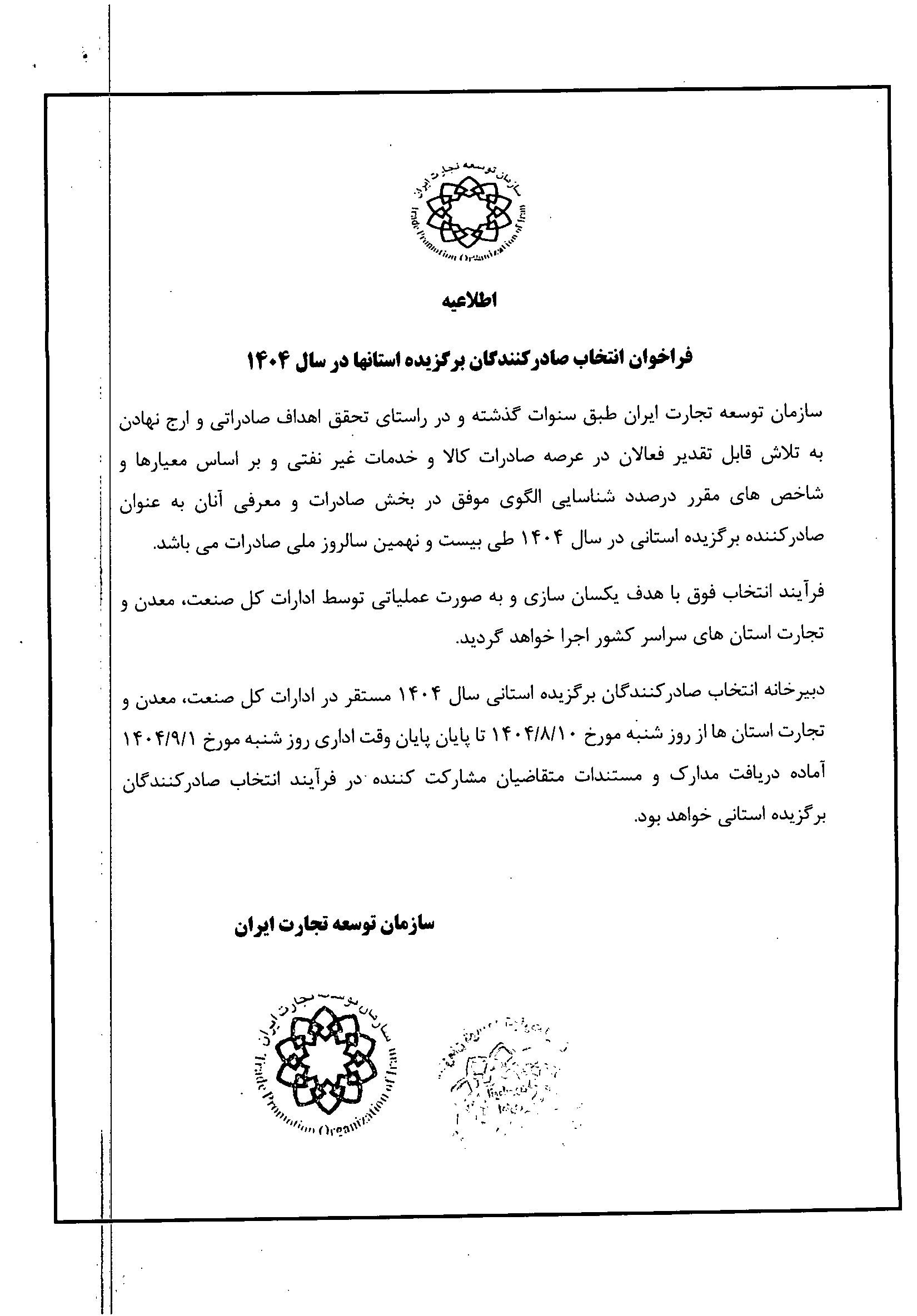 جهت مشاهده جزئیات فراخوان انتخاب صادرکننده برگزیده استانی سال ۱۴۰۴ و کسب اطلاعات بیشتر به فایل زیر مراجعه نمائید: